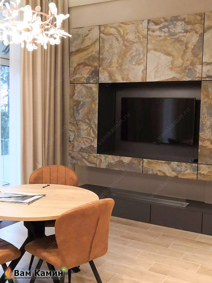 Видно, что хозяева креативно подошли к отделке интерьера. Топливный блок SteelHeat LINE GLASS 1000 интегрирован в тумбу, которая расположена под TV нишей. Стильная ТВ ниша, мраморная облицовка и новый топливный блок с защитным закаленным стеклом в серой тумбе образуют изящное дизайнерское решение. Линия огня в такой топливной горелке достигает 900 мм. Тепла такого топливного бака хватит на то, чтобы обогреть все помещение.